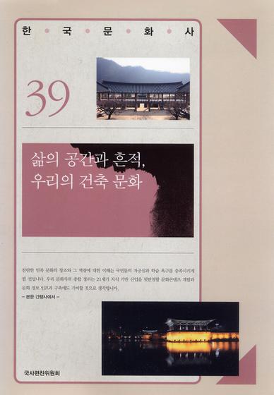 한국 문화사 간행사 삶의 공간과 흔적, 우리의 건축 문화를 내면서 1 한국 건축의 변화 양상 01 한국 건축사의 연구동향과 시대구분 02 한국 전통 건축 문화의 형성 03 한국 전통 건축의 특성 04 한국 전통 건축의 현대적 계승 2 모둠살이와 살림집 : 전통마을과 한옥 01 전통마을 02 한옥 3 정신세계의 통합공간 불교건축 01 정신세계의 혁명 02 가람제도라는 최초의 건축 형식 03 분화되는 히에로파니 04 법화사상과 가람제도 05 산간에 들어서는 비보사찰 06 새로운 깨달음의 세계 07 억불정책과 원당사찰 08 산중 승단과 불교의 중흥 09 회통불교시대의 산지가람 4 지배 정치 이념의 구현 : 유교건축 01 조선의 사회적 분위기와 유교건축 02 유교건축의 구성 및 개념 03 종류별 유교건축 5 왕권의 상징, 궁궐 건축 01 머리말 02 고대 국가의 궁궐 03 고려 왕조의 궁궐 04 조선 왕조의 궁궐 부록 주석 찾아보기